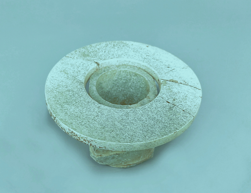 玉璧(编号总0129:5)直经9厘米,单面钻孔,大端孔径4.4厘米,小端孔径4厘米,厚度0.55—0.7厘米,璧外缘有磕碰痕。