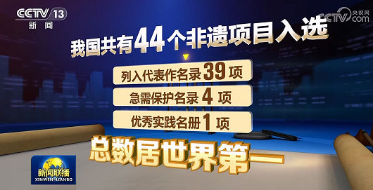 联合国教科文组织非遗名录名册,包括三种类型:人类非物质文化遗产代表作名录、急需保护的非物质文化遗产名录,以及优秀实践名册。据央视新闻联播报道,截止2024年12月5日,我国已有44个项目(39+4+1)列入联合国教科文组织非物质文化遗产名录、名册,总数居世界第一,充分展示了我国开展非遗系统性保护的优秀实践和突出成果。