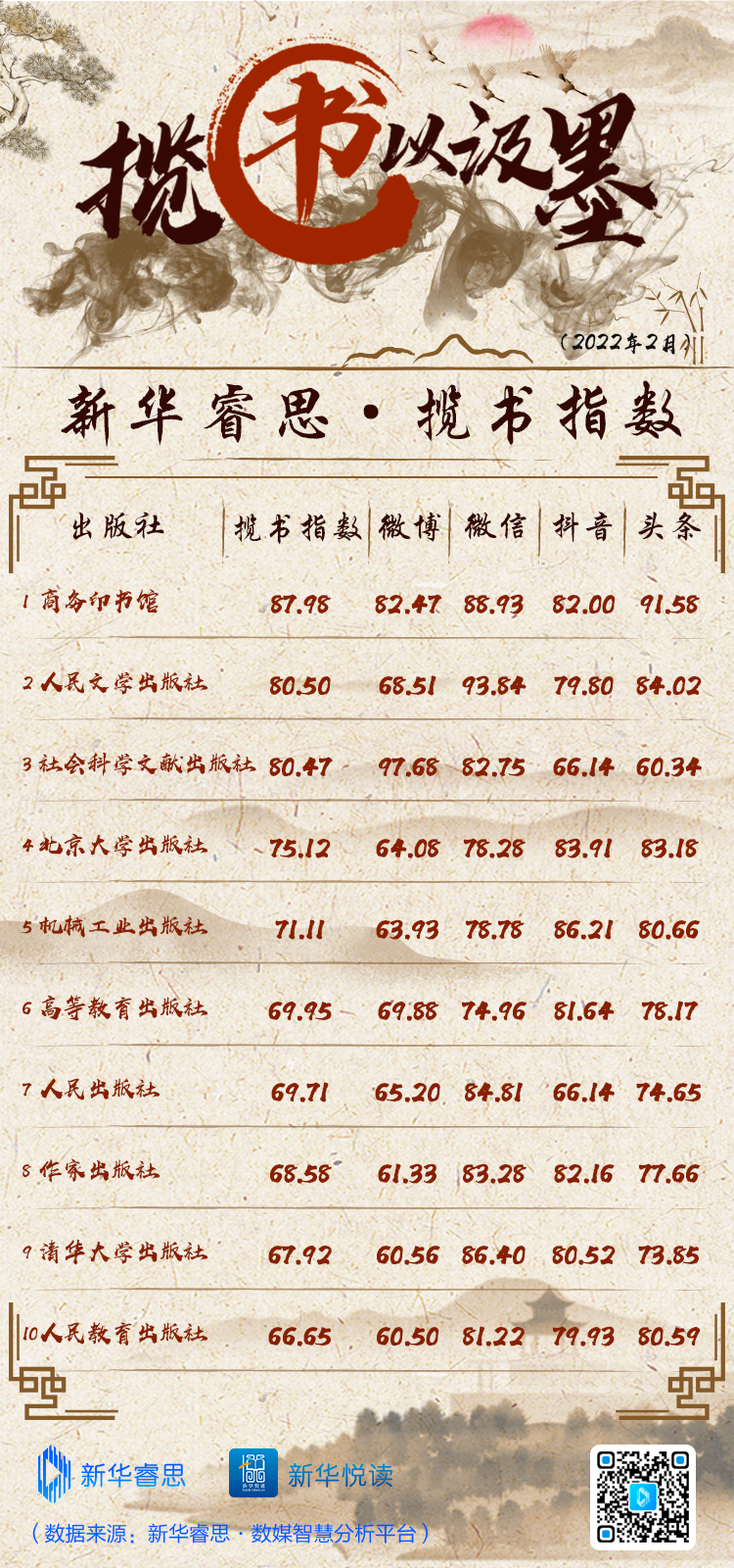 新华睿思·揽书指数榜单以中央级图书出版单位为切入点,基于新华睿思百亿数据资源池,对各出版单位在包括微博、微信、抖音、头条在内的国内社交媒体平台进行传播数据追踪,并通过“睿思+”权重对主要数据指标进行加权计算,综合得出新华睿思·揽书指数,为内容出版机构提供信息参考。