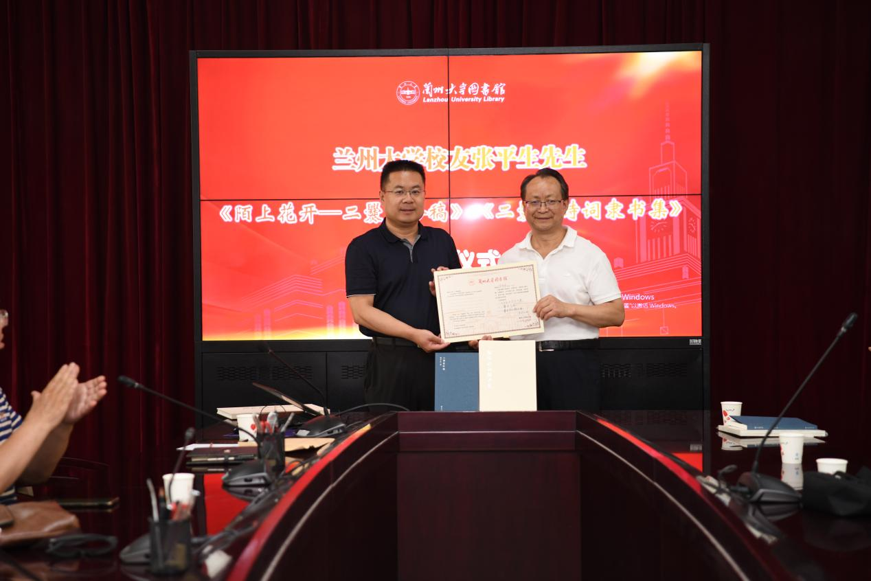 兰州大学图书馆及直属单位党委书记王伟国向张平生颁发收藏证书