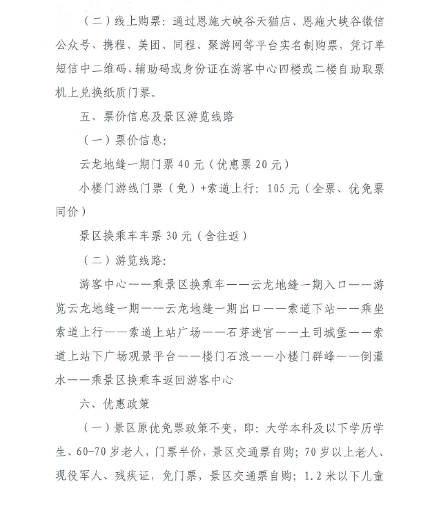 优惠政策方面,景区原优免票政策不变;与此同时,全国医护人员、援鄂医疗队员、天津援助恩施医疗队员按湖北省文旅厅、恩施市文旅局相关优惠政策(凭有效证件)免门票;天津市民凭有效证件享受门票半价。