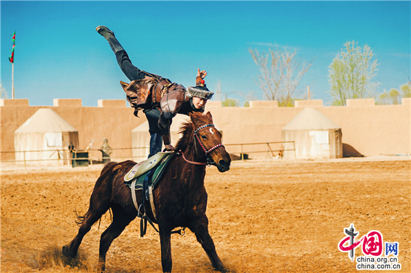 除此之外,游客在景区擂台处不仅能够观看惊险刺激的市井杂耍,还有每天两场的乐队表演不容错过。擂台不远处就是今年4月1日全新推出的实景马战《烽火西夏》演出场地,看完杂耍的游客可直接到马场观看接下来的演出。
