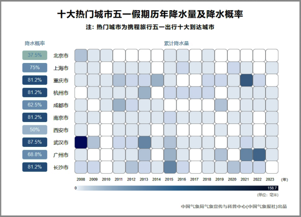 我们选取了携程旅行公布的五一假期十大热门旅游目的地,来看看自2008年以来,热门出行城市下雨的概率有多少?降水量大不大?